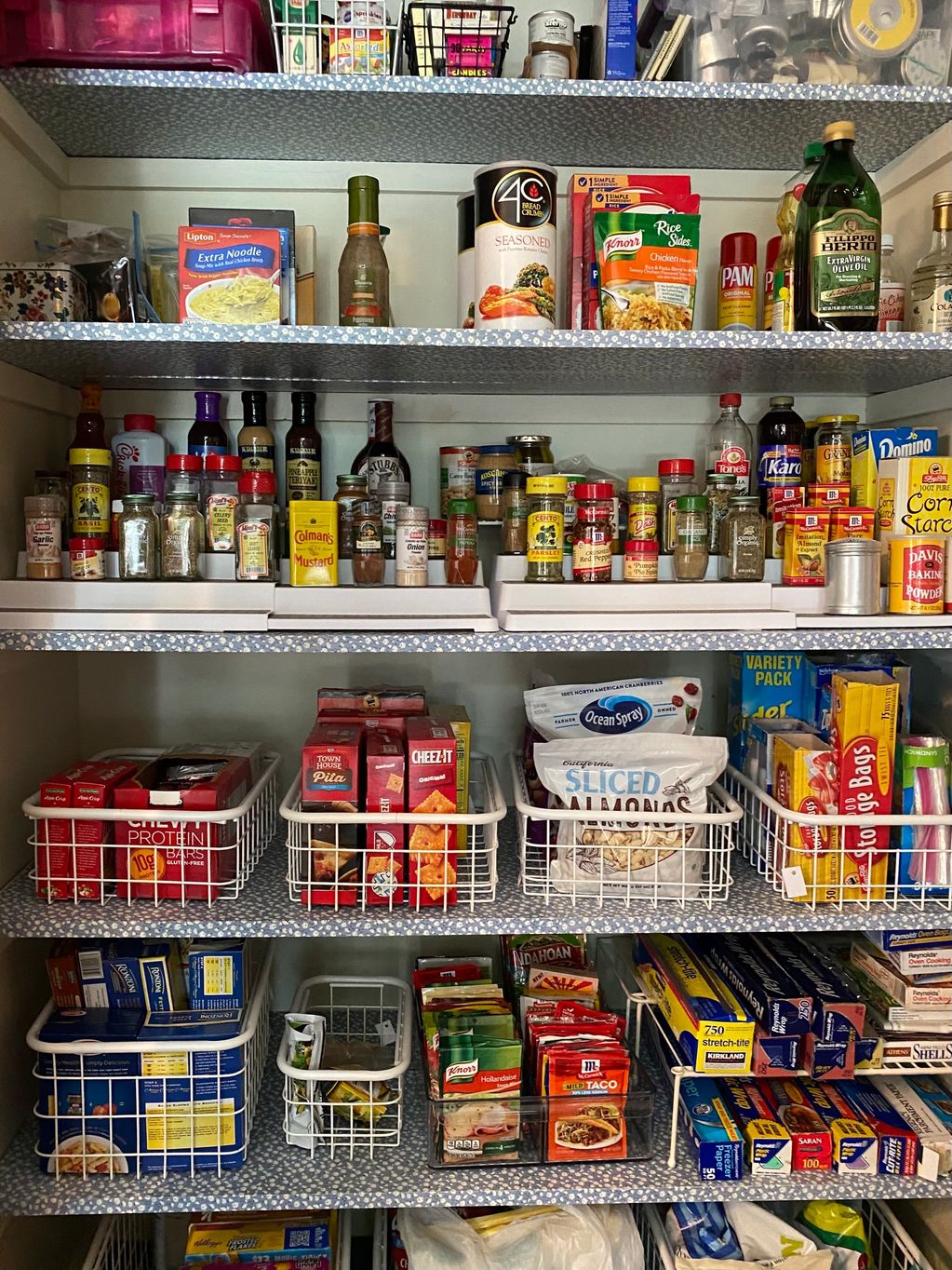 Using tiered risers help finding small spice jars is a breeze. Grouping items together in storage bins make meal prep and snack time easy. Shelf risers utilize vertical space.